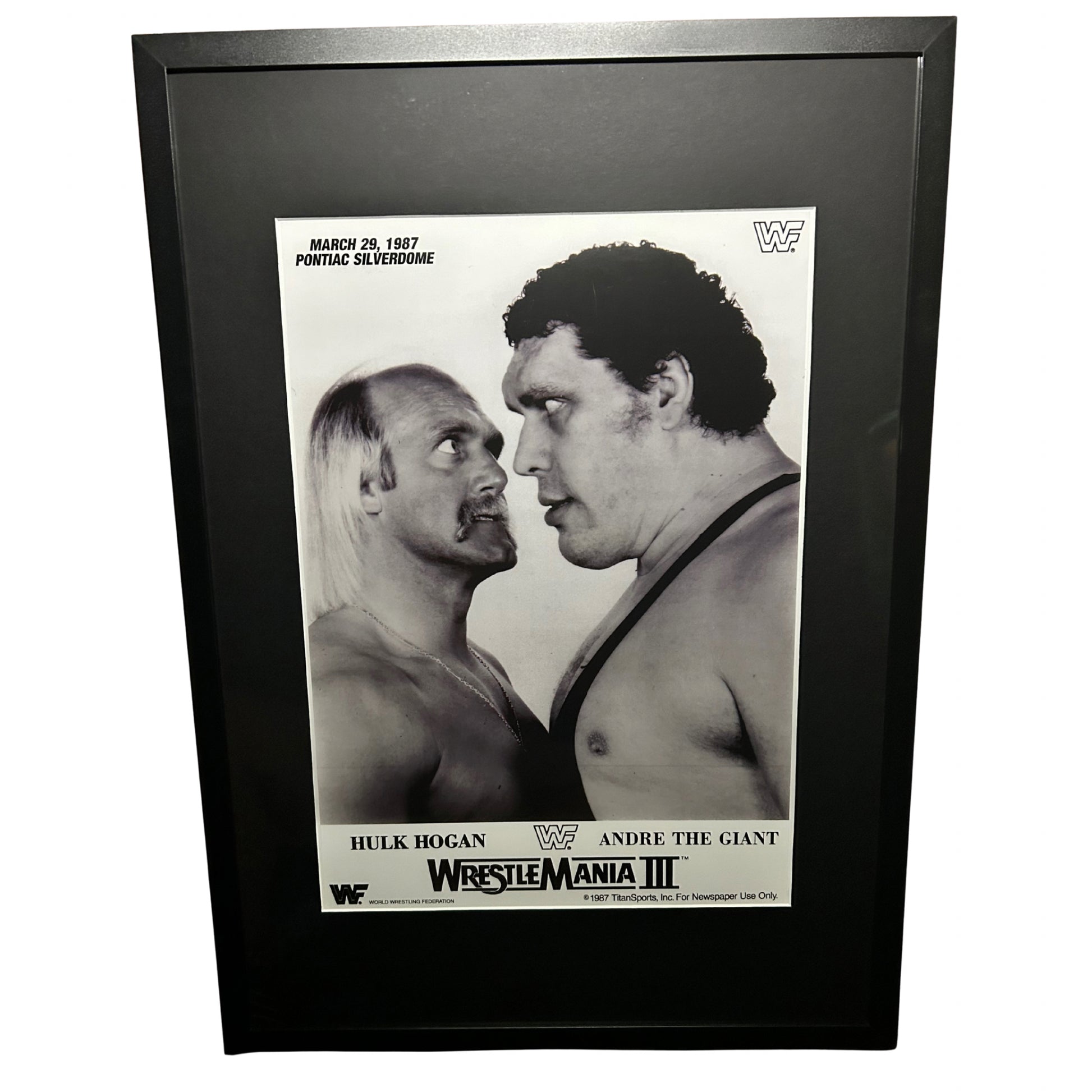 Framed Wrestlemania III poster, featuring the main event, Hulk Hogan vs Andre the Giant.